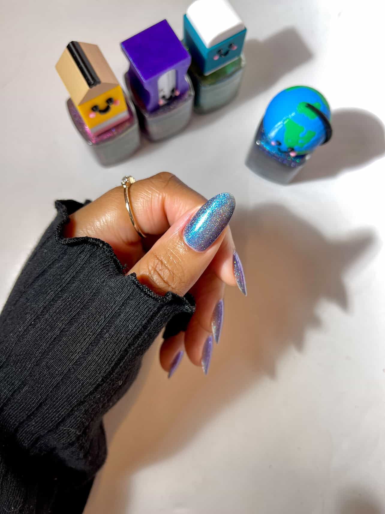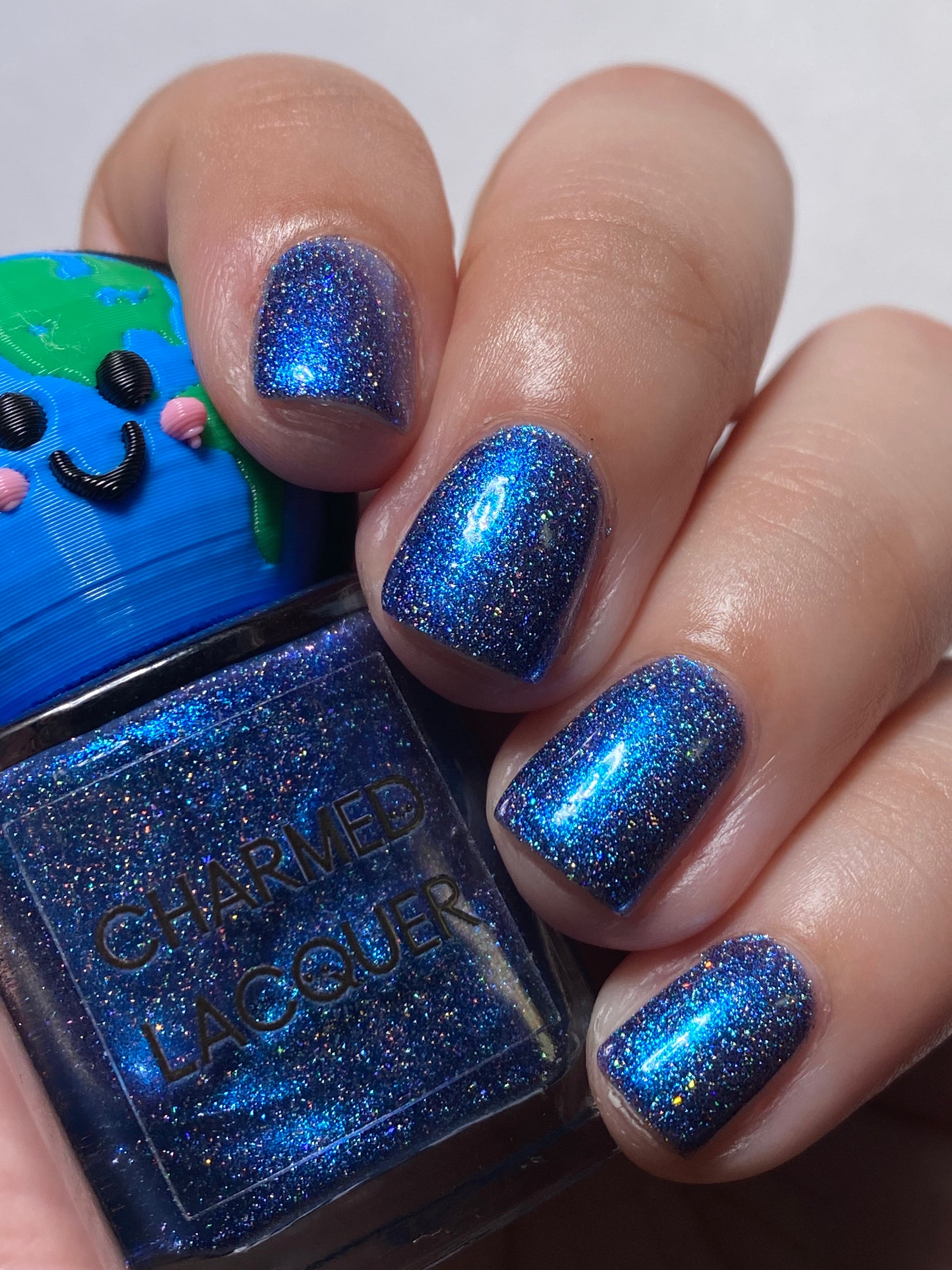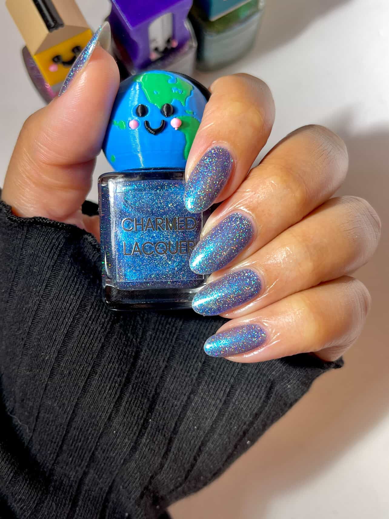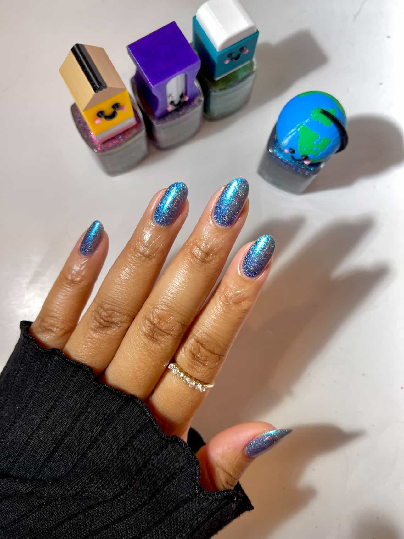 A blue holographic chameleon polish. It shifts from blue to purple to pink at extreme angles.