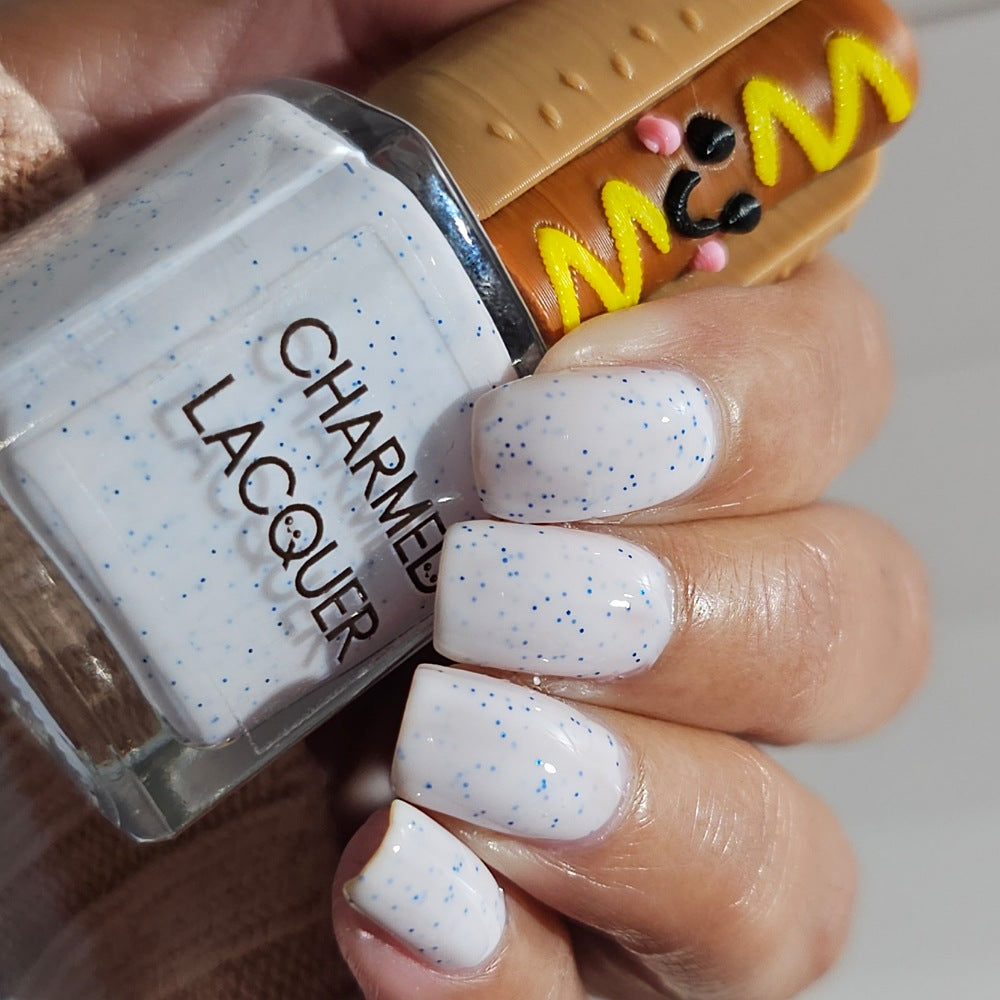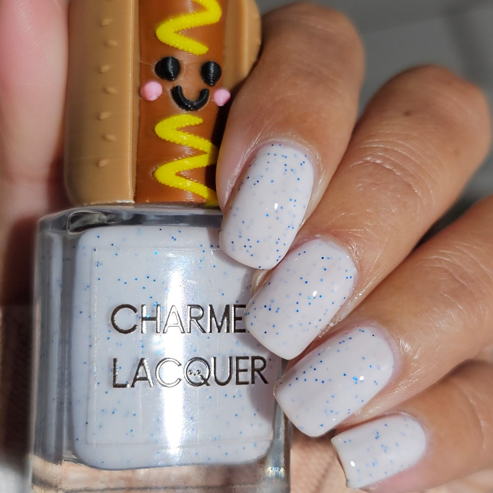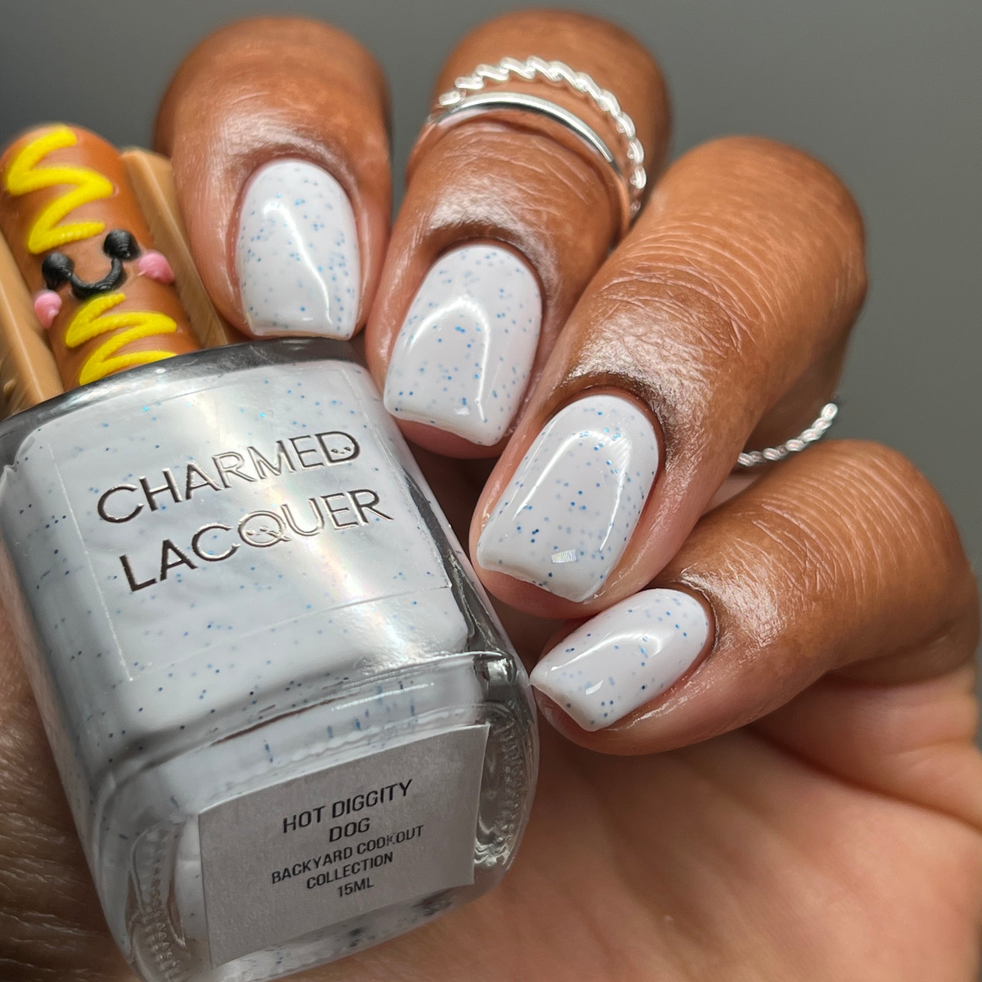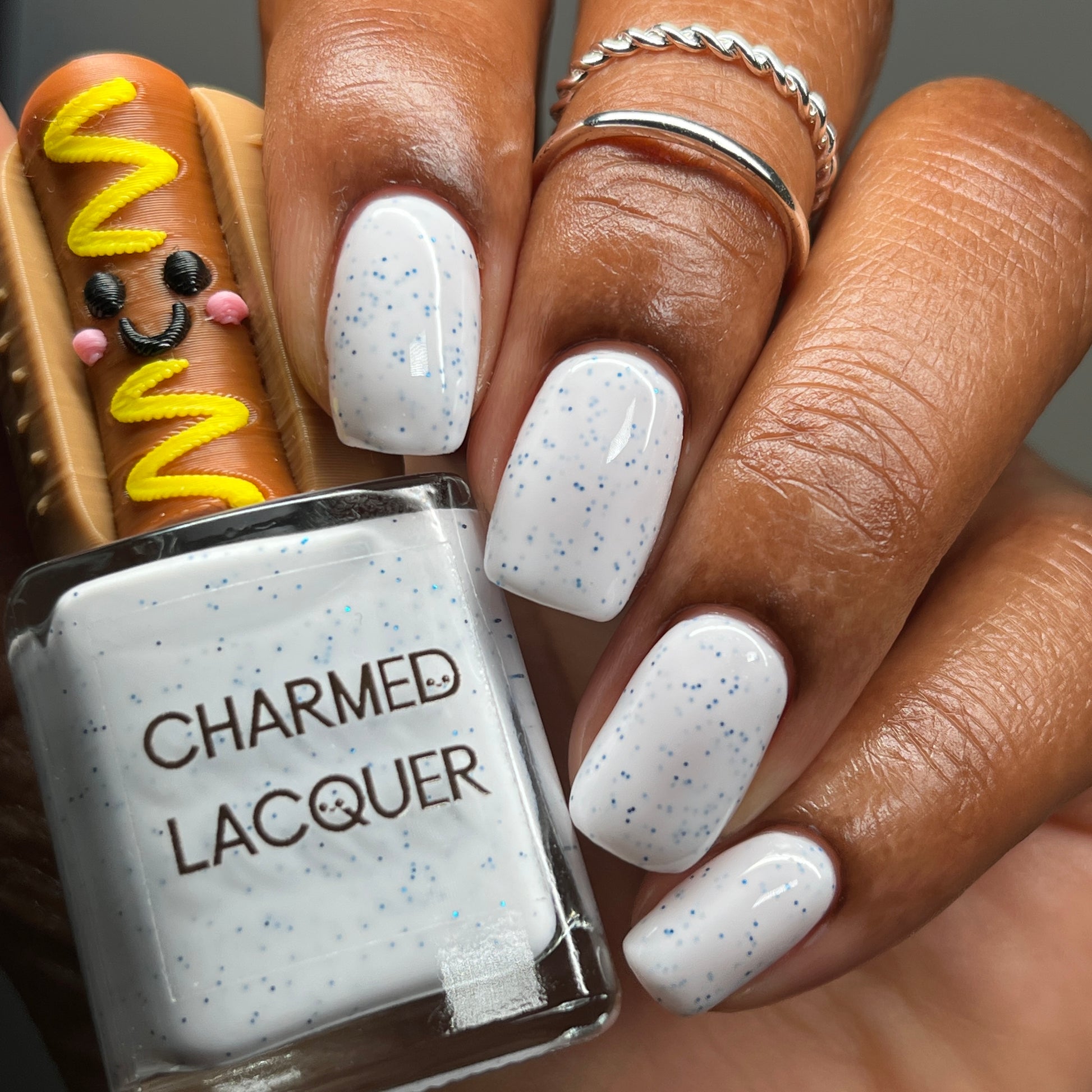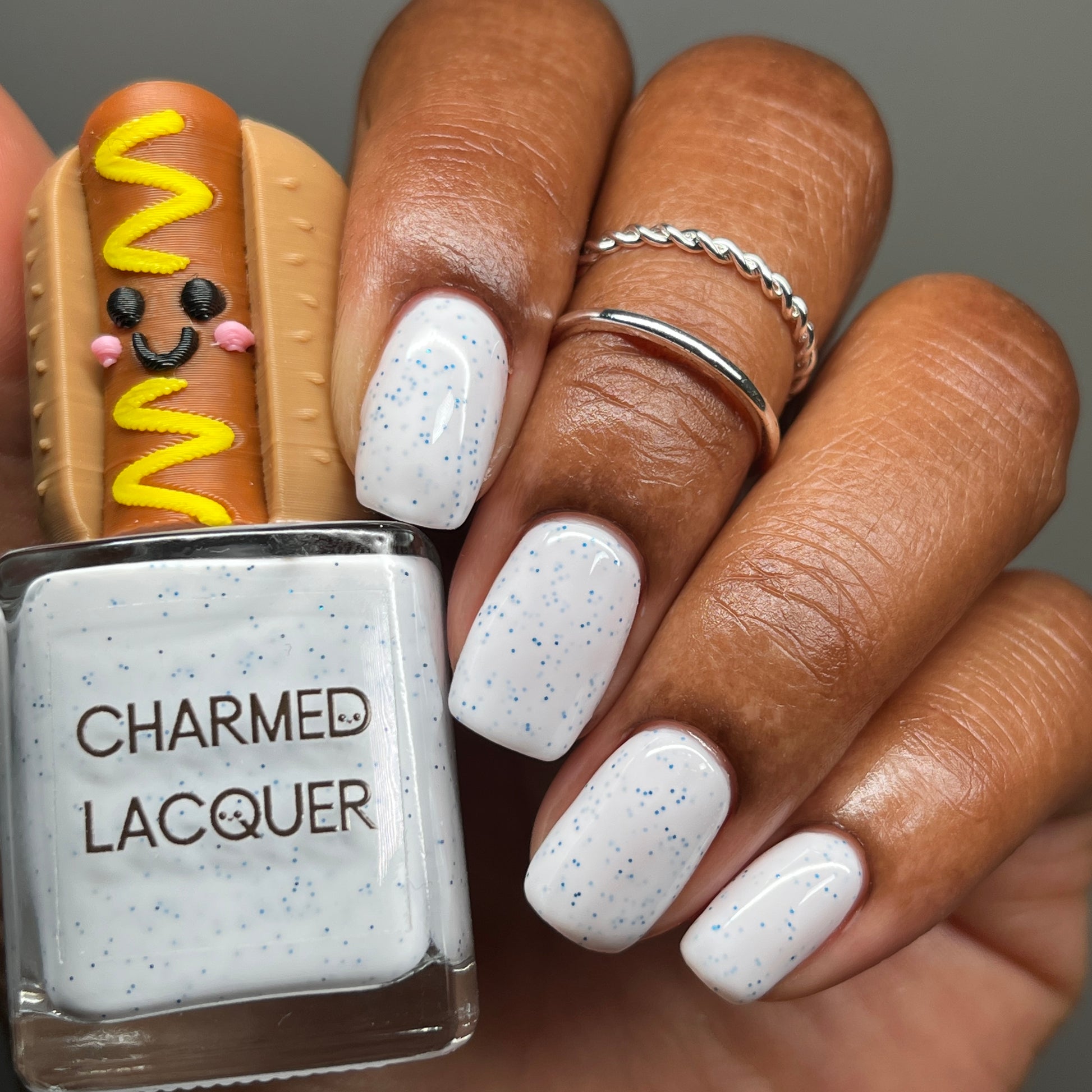 The hotdog is so cute! I received these polishes with stickers and a lovely bracelet. A+ I like that each applicator has a design. I can clean and keep the applicator when this polish runs out. This color is jelly like, which made me happy. I did notice the consistency is a bit sticky. I expect this though with white polishes. I applied more on the second coat. I plan on buying a bottle of nail polish thinner that is free of heptane since I don't want to ruin the glitters. Maybe this could be a product option. I thought of a teardrop lid, or even a squirt bottle of heptane-free nail polish thinner like the refill options for basecoat, quick-dry top coat, and almond oil.