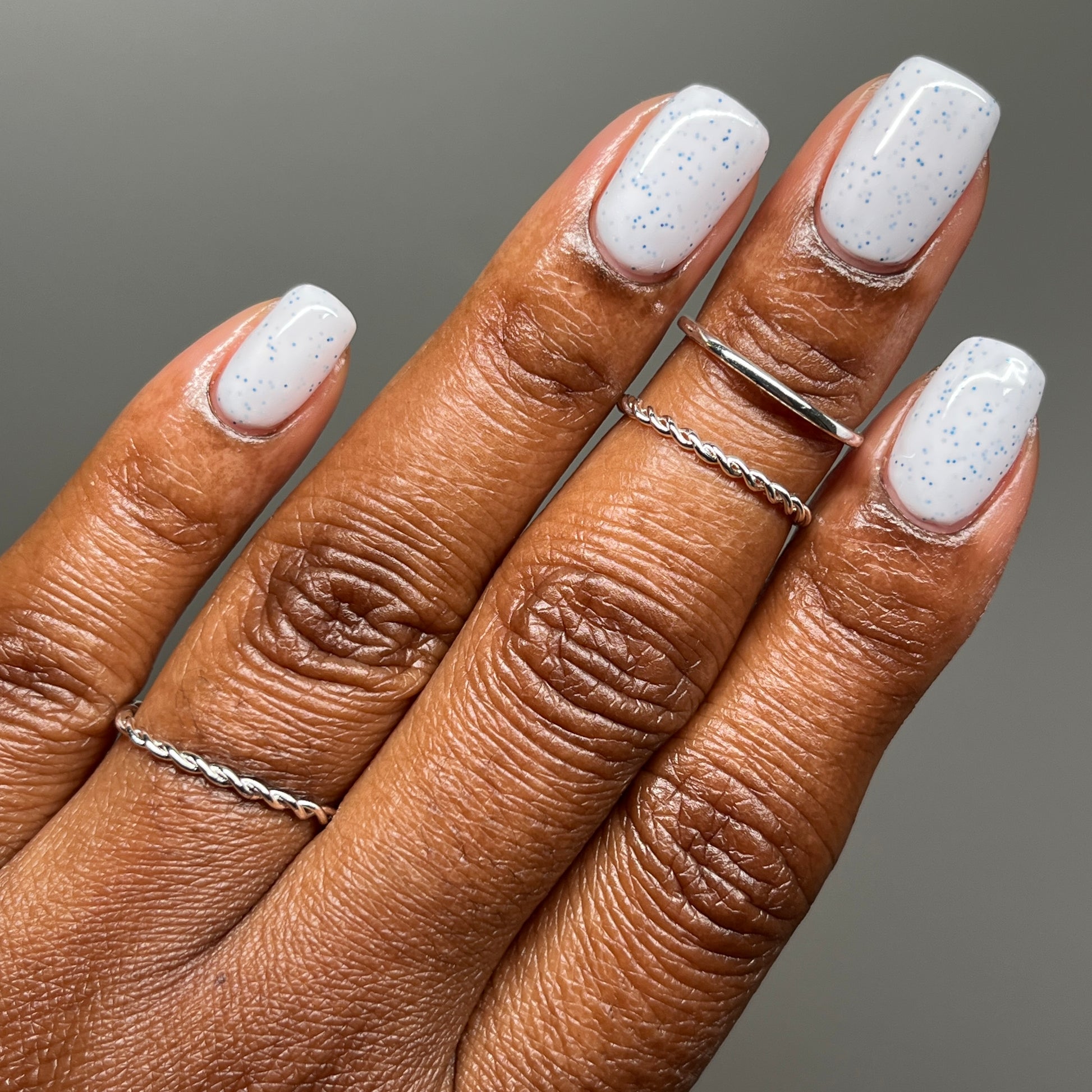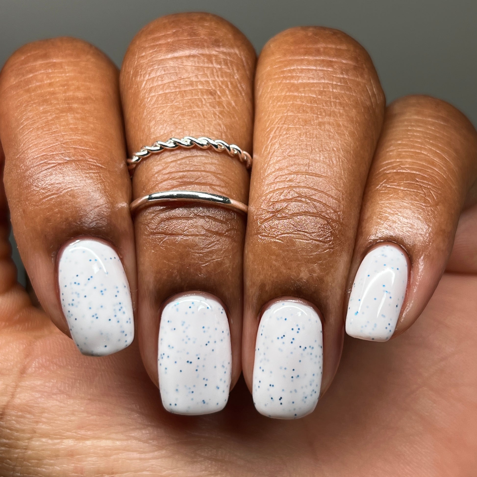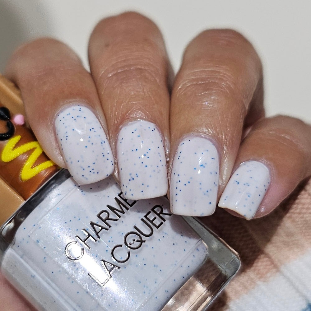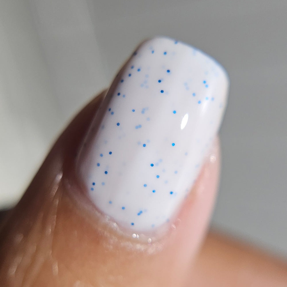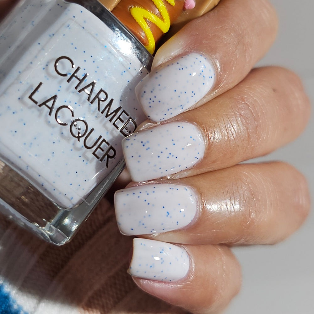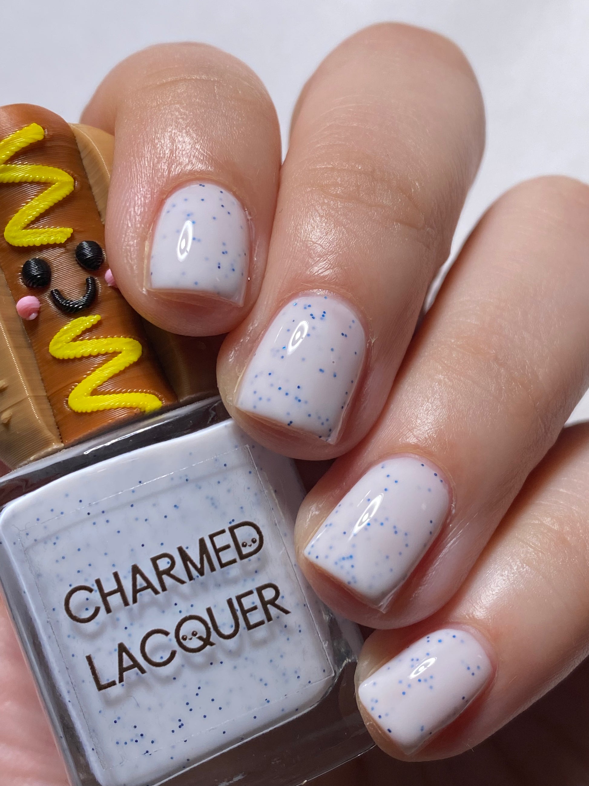 The hotdog is so cute! I received these polishes with stickers and a lovely bracelet. A+ I like that each applicator has a design. I can clean and keep the applicator when this polish runs out. This color is jelly like, which made me happy. I did notice the consistency is a bit sticky. I expect this though with white polishes. I applied more on the second coat. I plan on buying a bottle of nail polish thinner that is free of heptane since I don't want to ruin the glitters. Maybe this could be a product option. I thought of a teardrop lid, or even a squirt bottle of heptane-free nail polish thinner like the refill options for basecoat, quick-dry top coat, and almond oil.