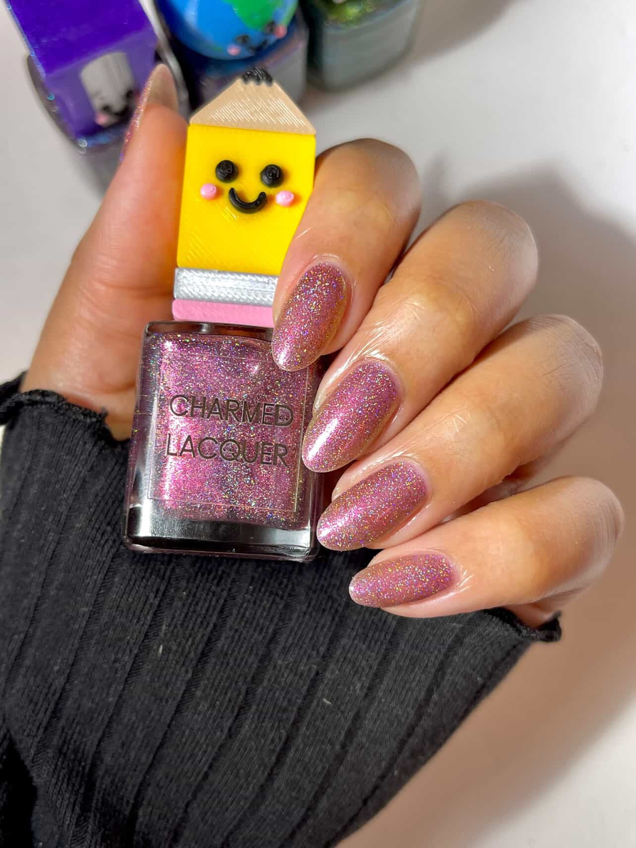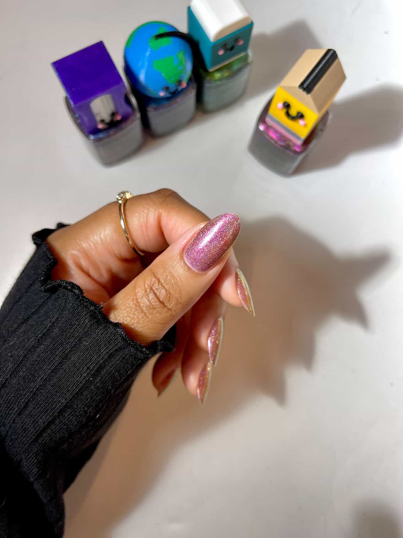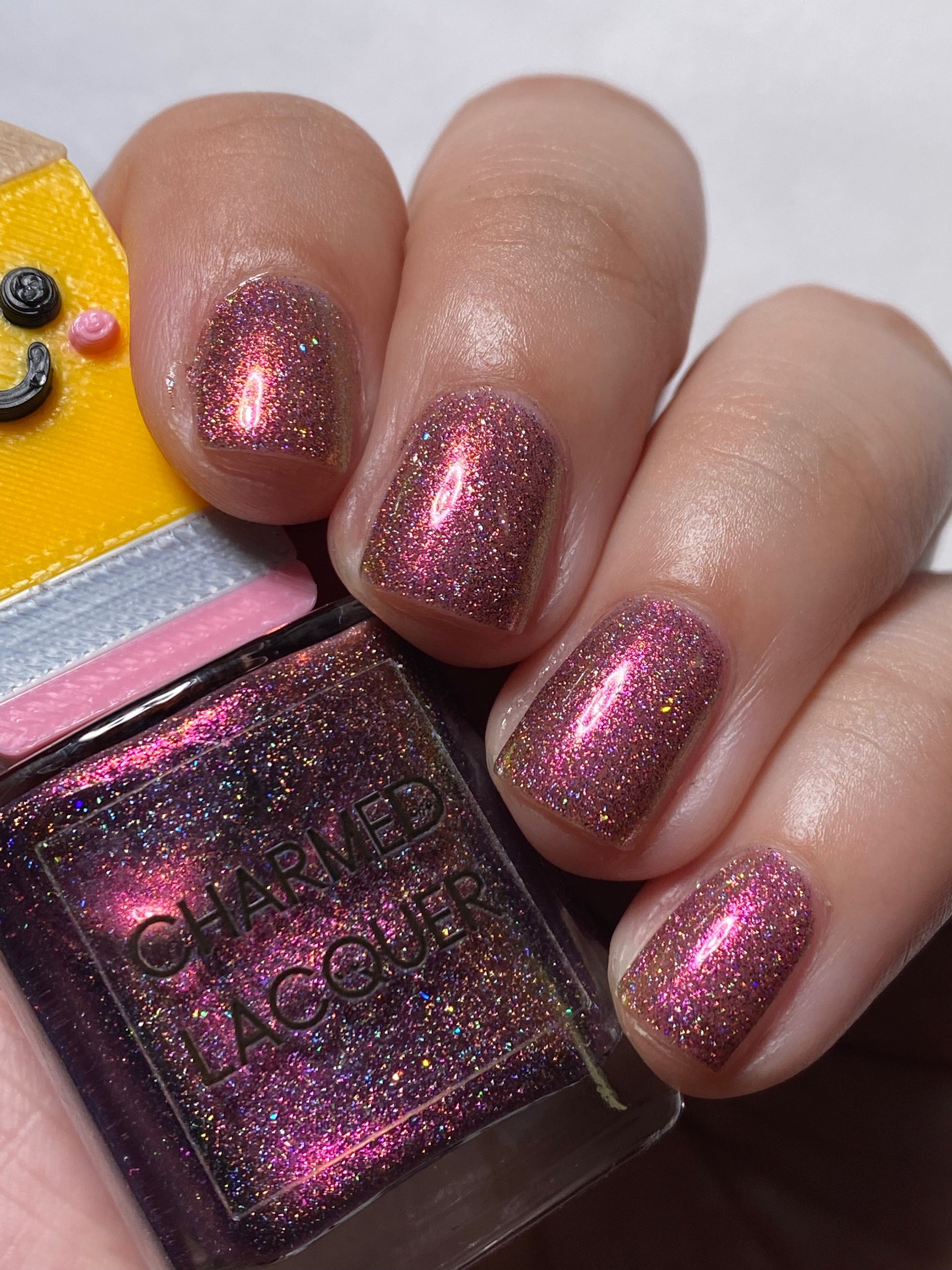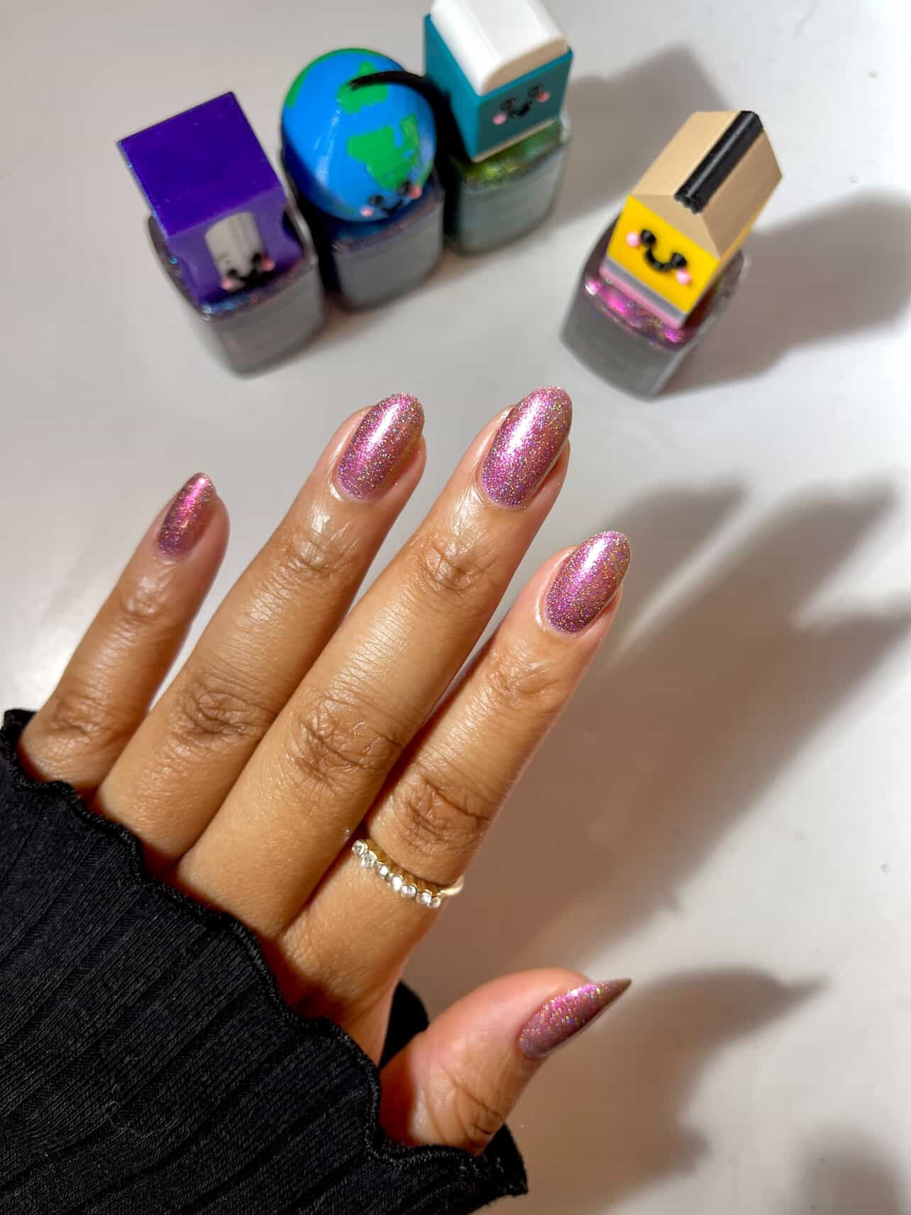 A pink holographic chameleon polish. It shifts from pink to green to goldish yellow at extreme angles.