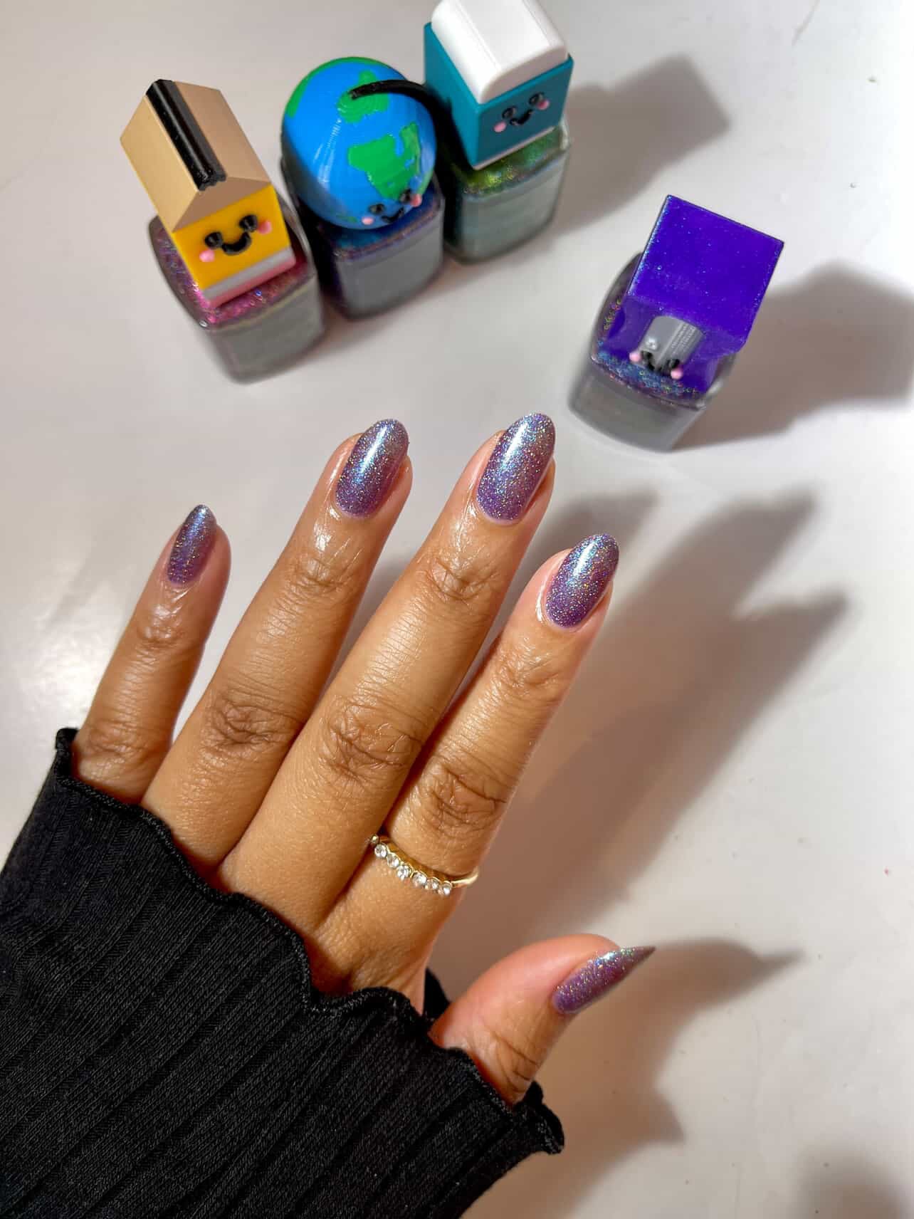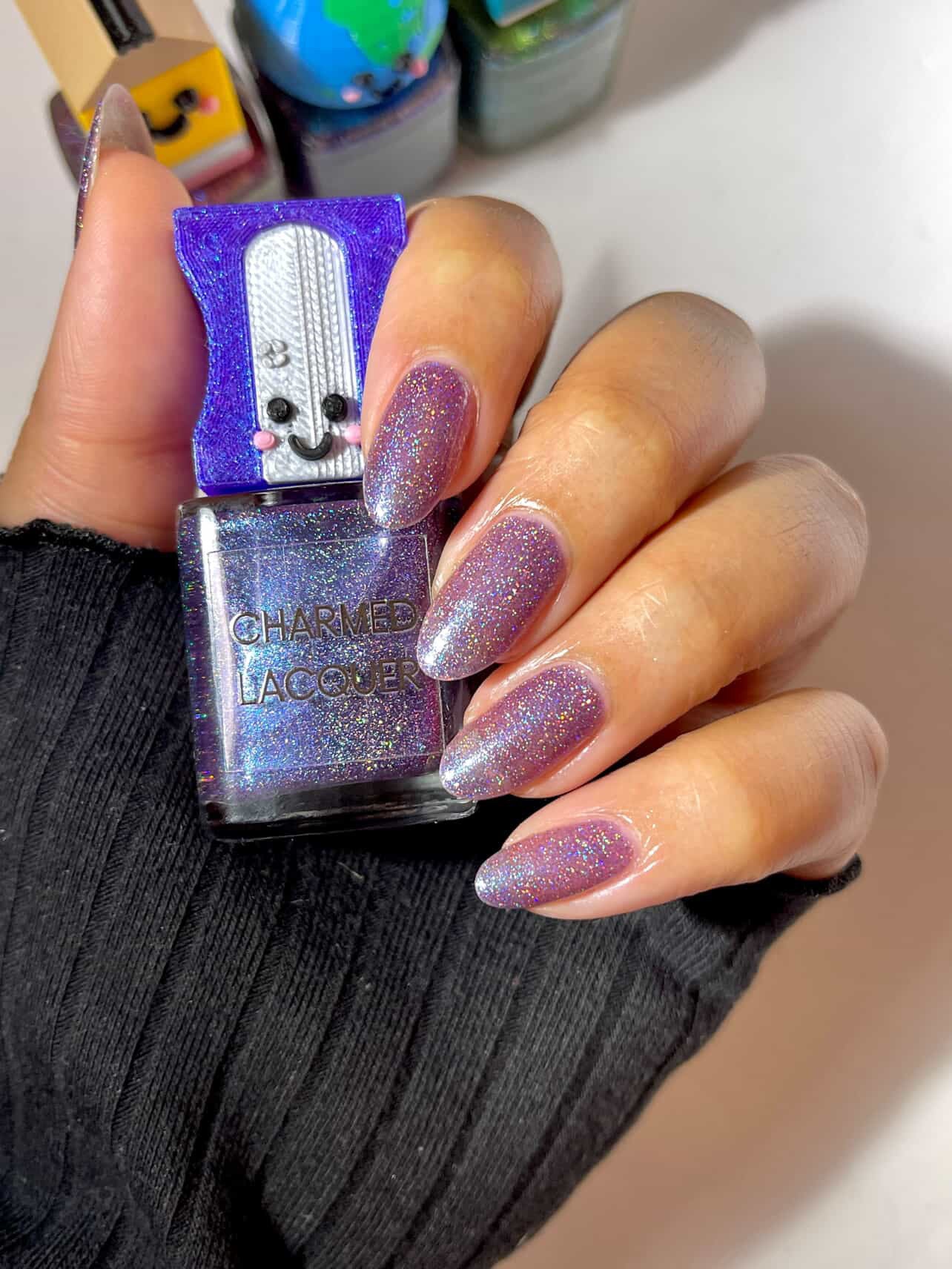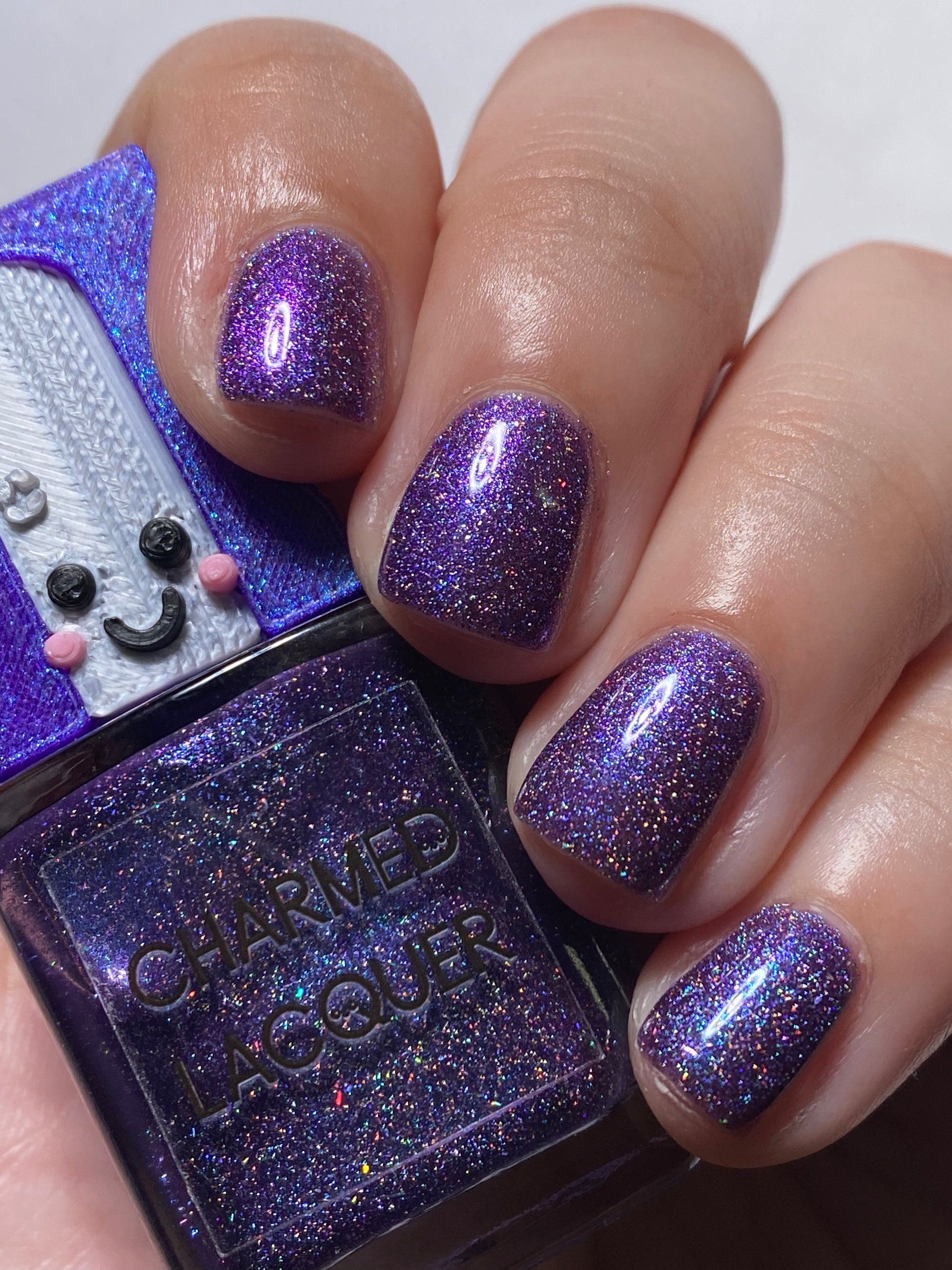 Petra I love this color, it is so pretty. The holo pieces shine beautifully. The nail polish cap is so cute and also has a blue shimmer in the purple color which is a nice reflection of the color itself ! I love the way the nail polish cap feels when I am holding it to paint. The inward curve feels very nice and its easy to paint with.